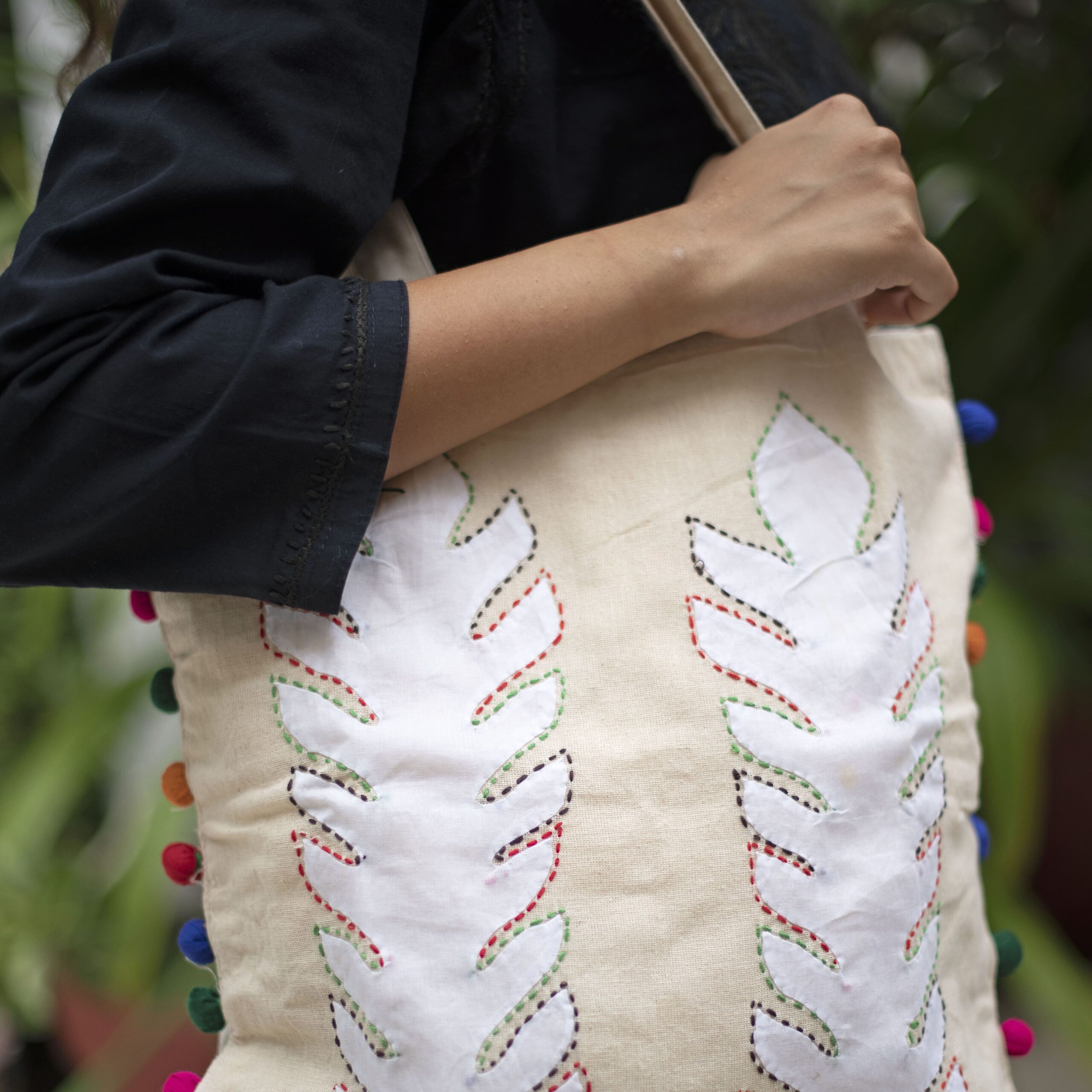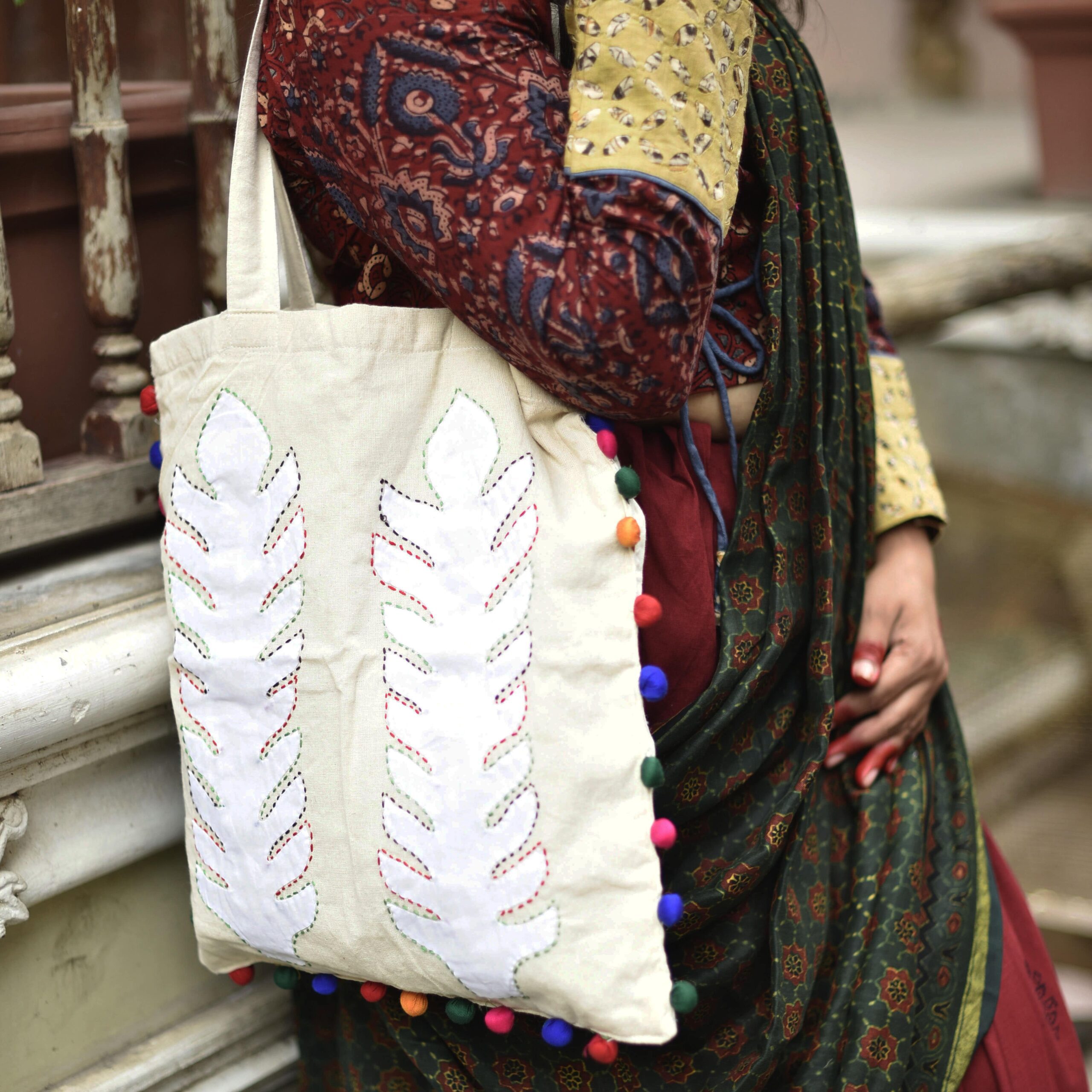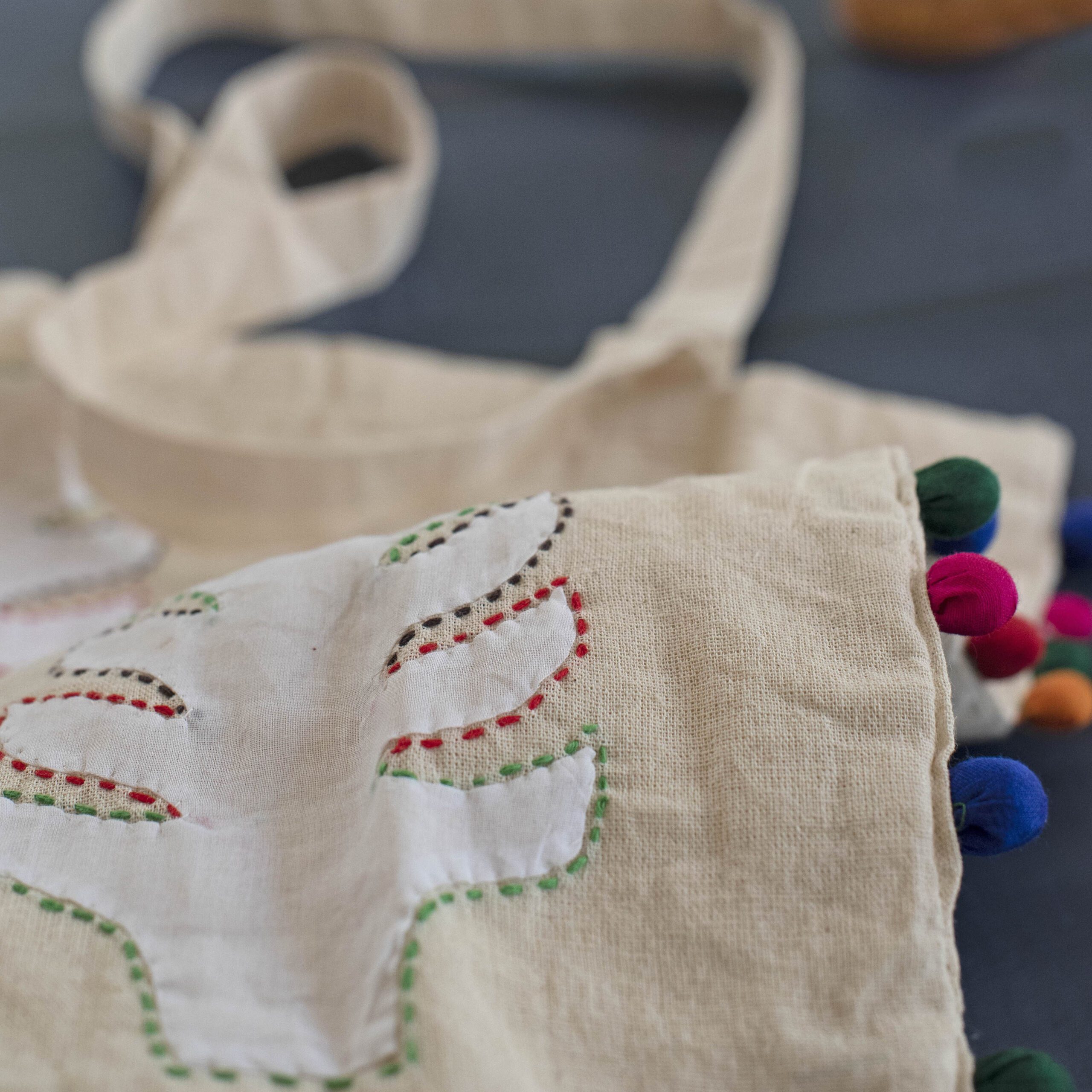A perfect gifting option, this incredibly functional, unisex and easy-to-pair white muslin tote bag is embellished with applique work done with Mul Mul, multicoloured running stitch embroidery, and multicoloured potlis on the edges. You can use it as a hand bag or shopping bag. This stylish bag is roomy and can hold essentials, books, stationery, water bottle, everything you would need for a day out!