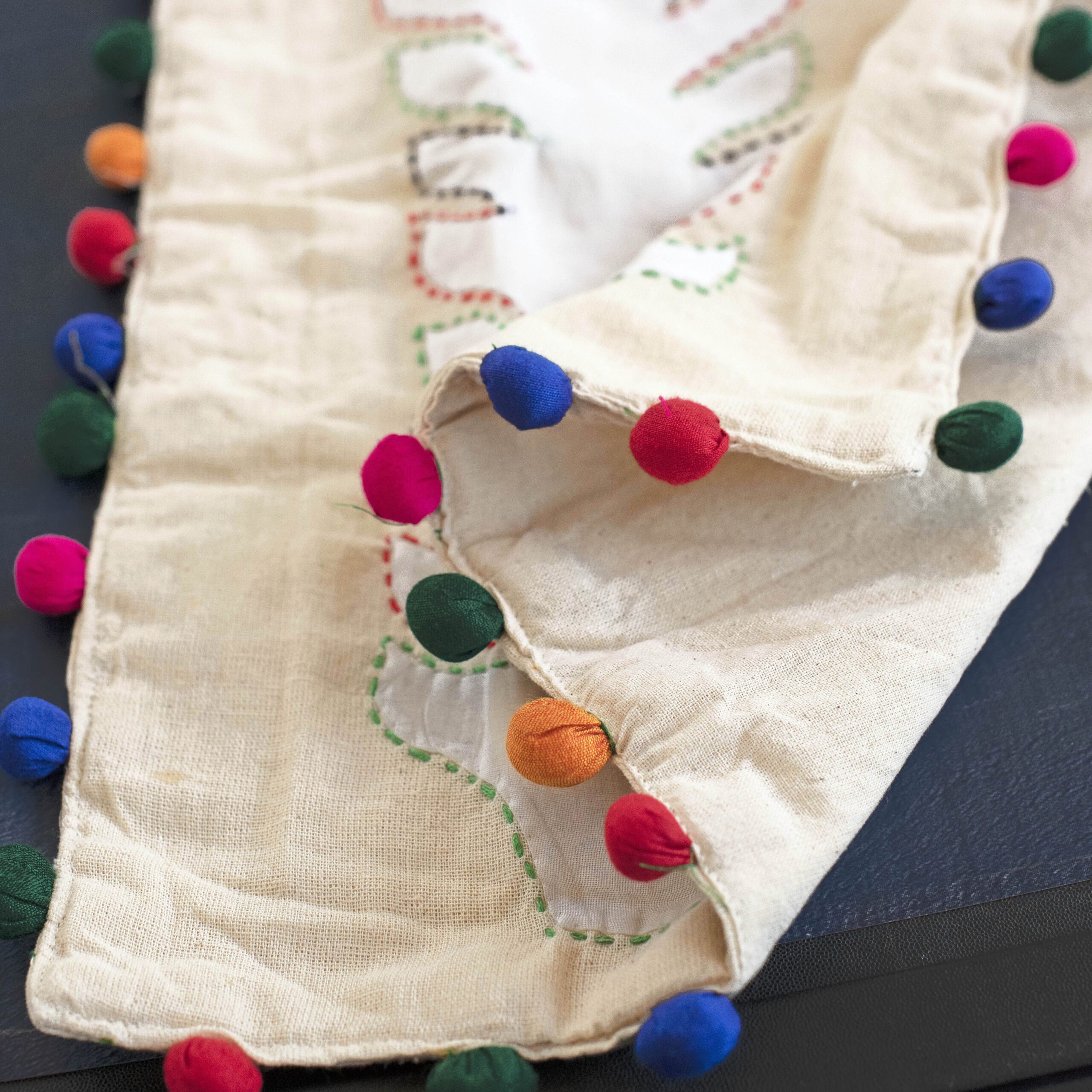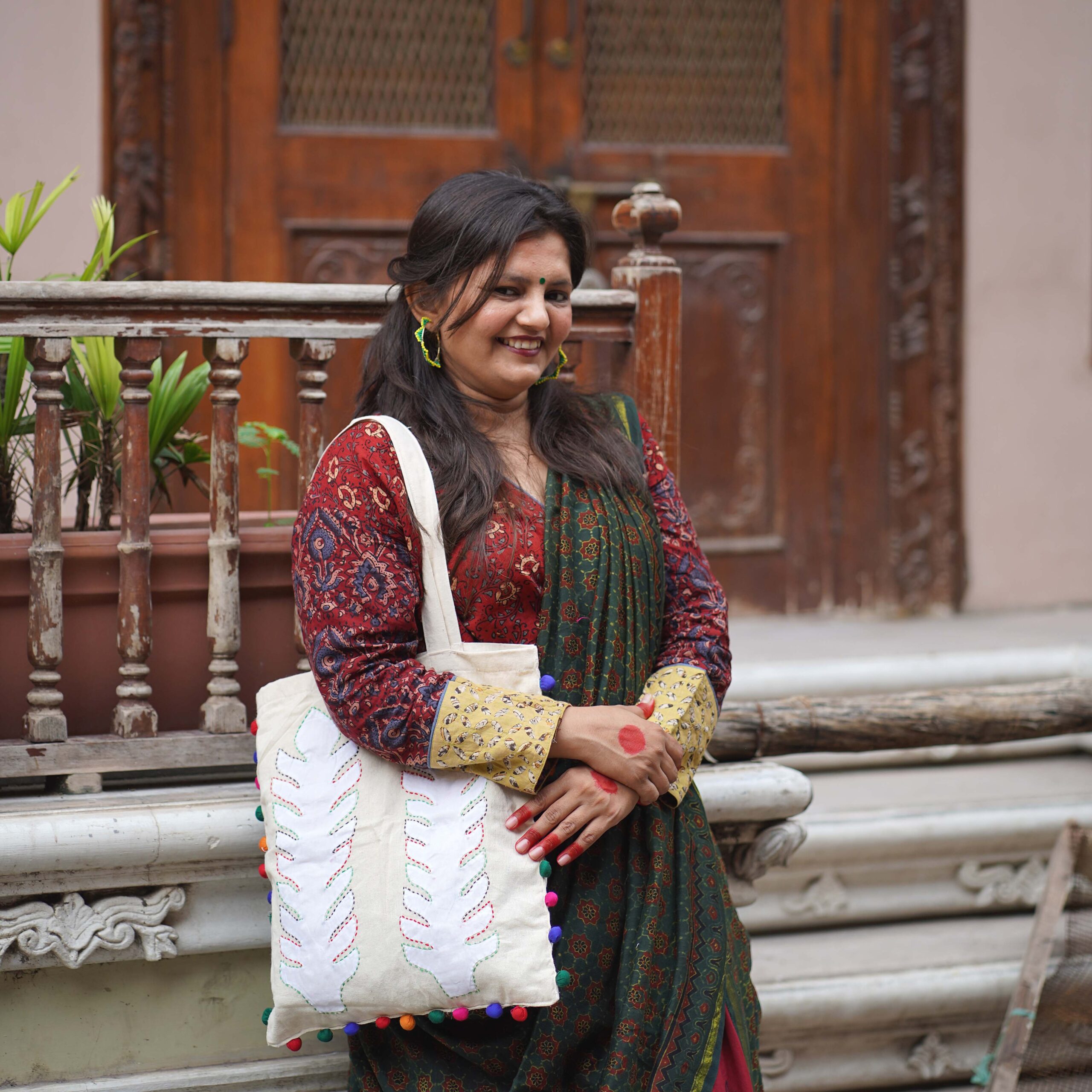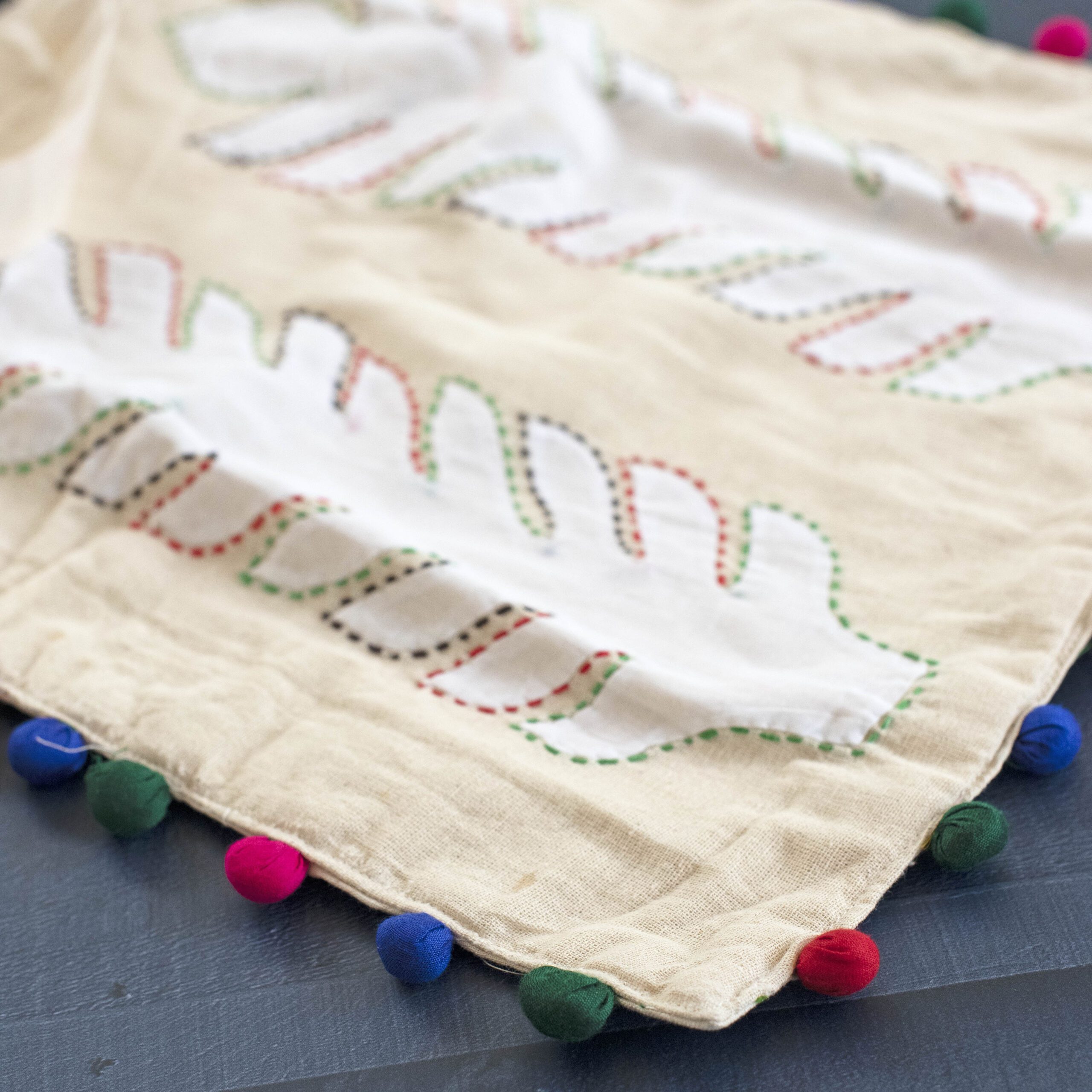 A perfect gifting option, this incredibly functional, unisex and easy-to-pair white muslin tote bag is embellished with applique work done with Mul Mul, multicoloured running stitch embroidery, and multicoloured potlis on the edges. You can use it as a hand bag or shopping bag. This stylish bag is roomy and can hold essentials, books, stationery, water bottle, everything you would need for a day out!