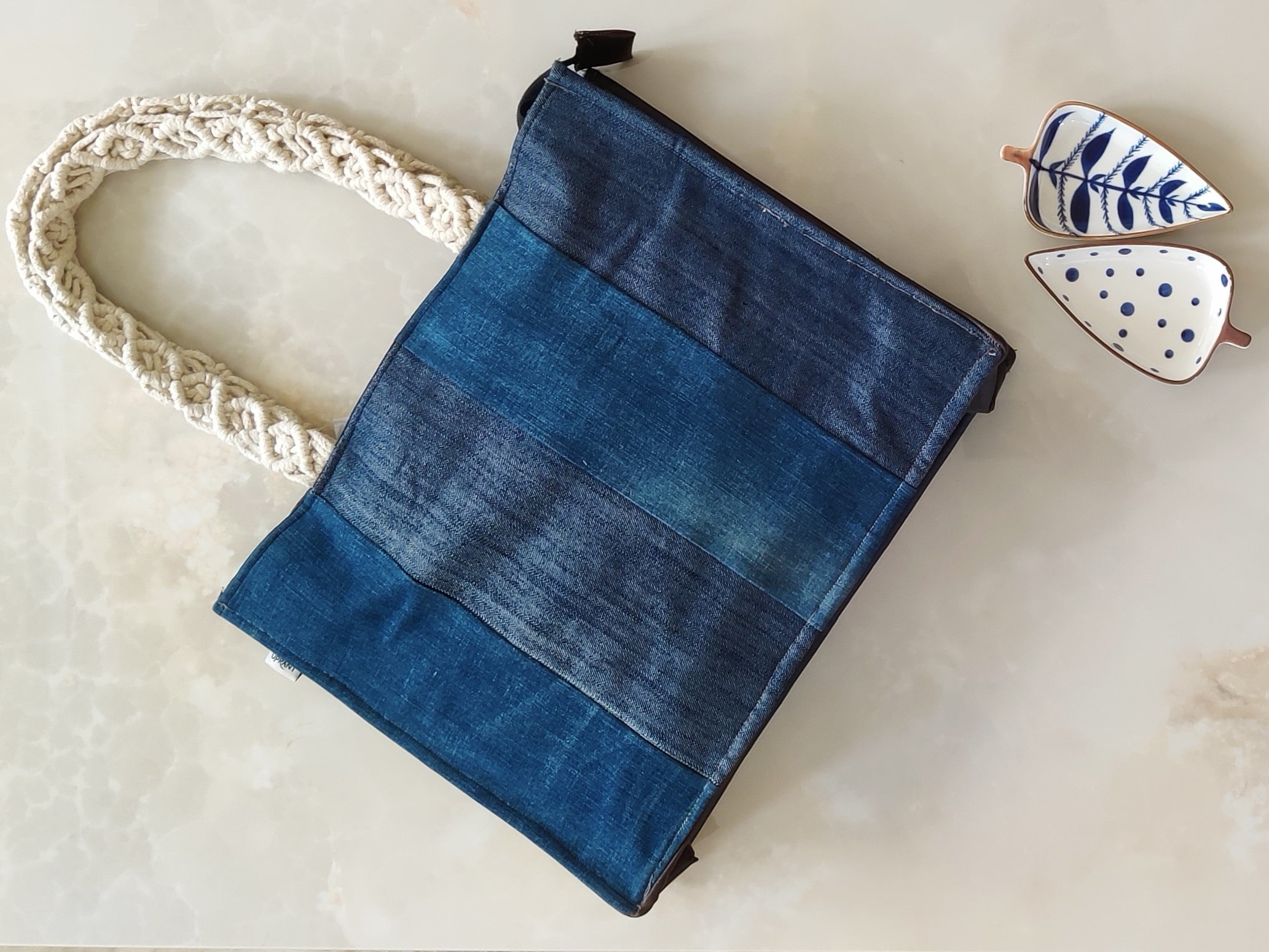 Our “EcoDenim Macrame Tote Bag” – a chic and conscious fashion statement. Handcrafted by skilled women ragpickers of Ahmedabad, this tote is crafted from upcycled denim waste fabrics, reducing environmental impact. Its unique macrame handle adds a touch of boho charm. Embrace sustainable style and support empowerment today.