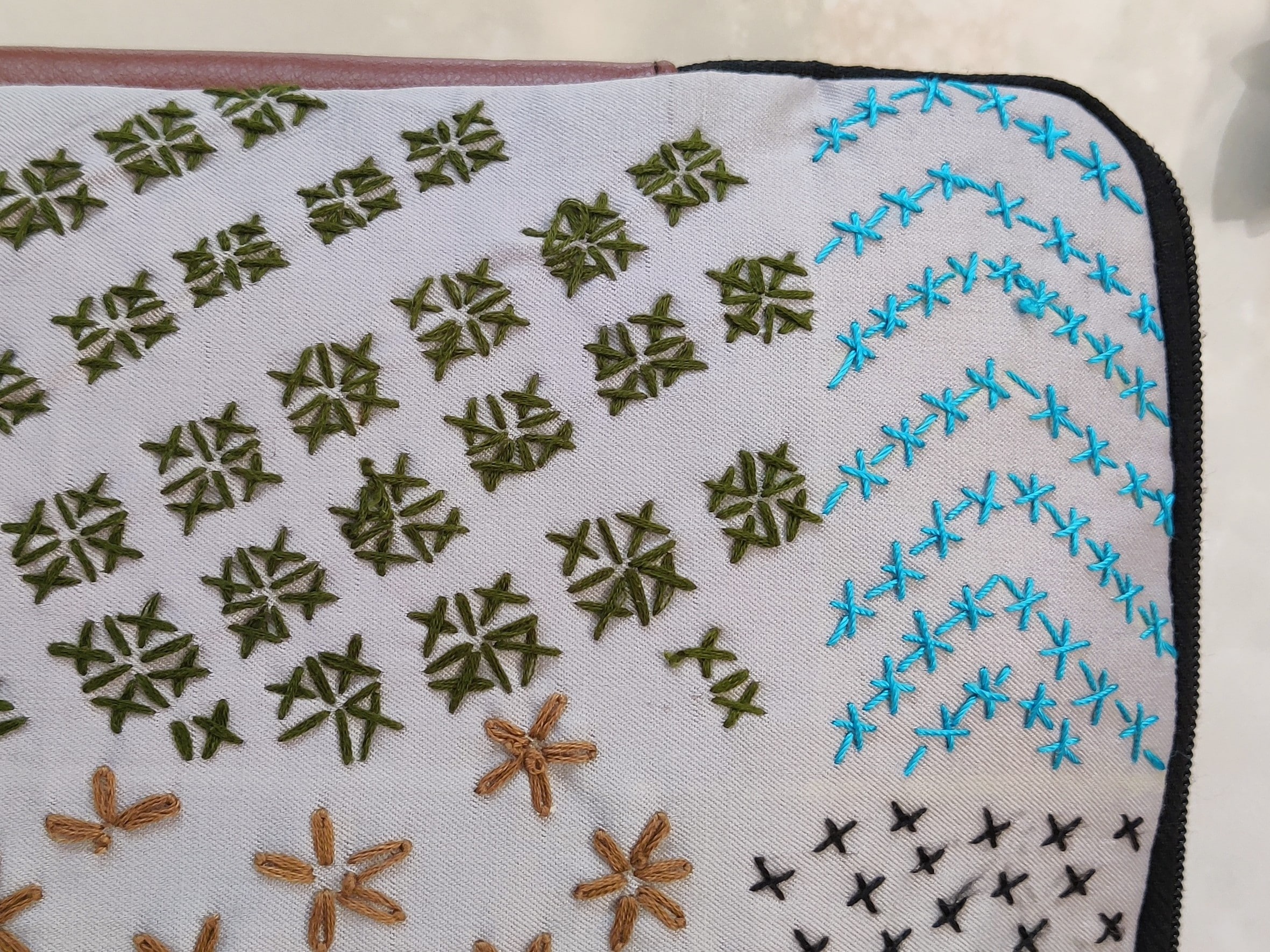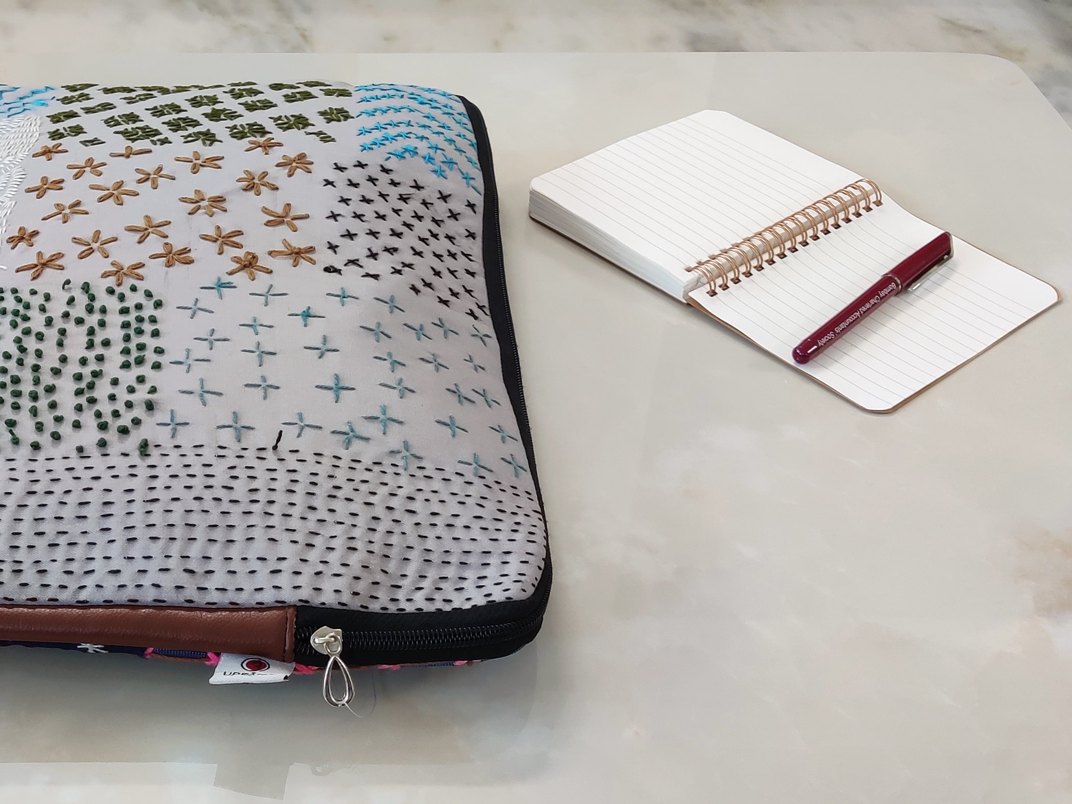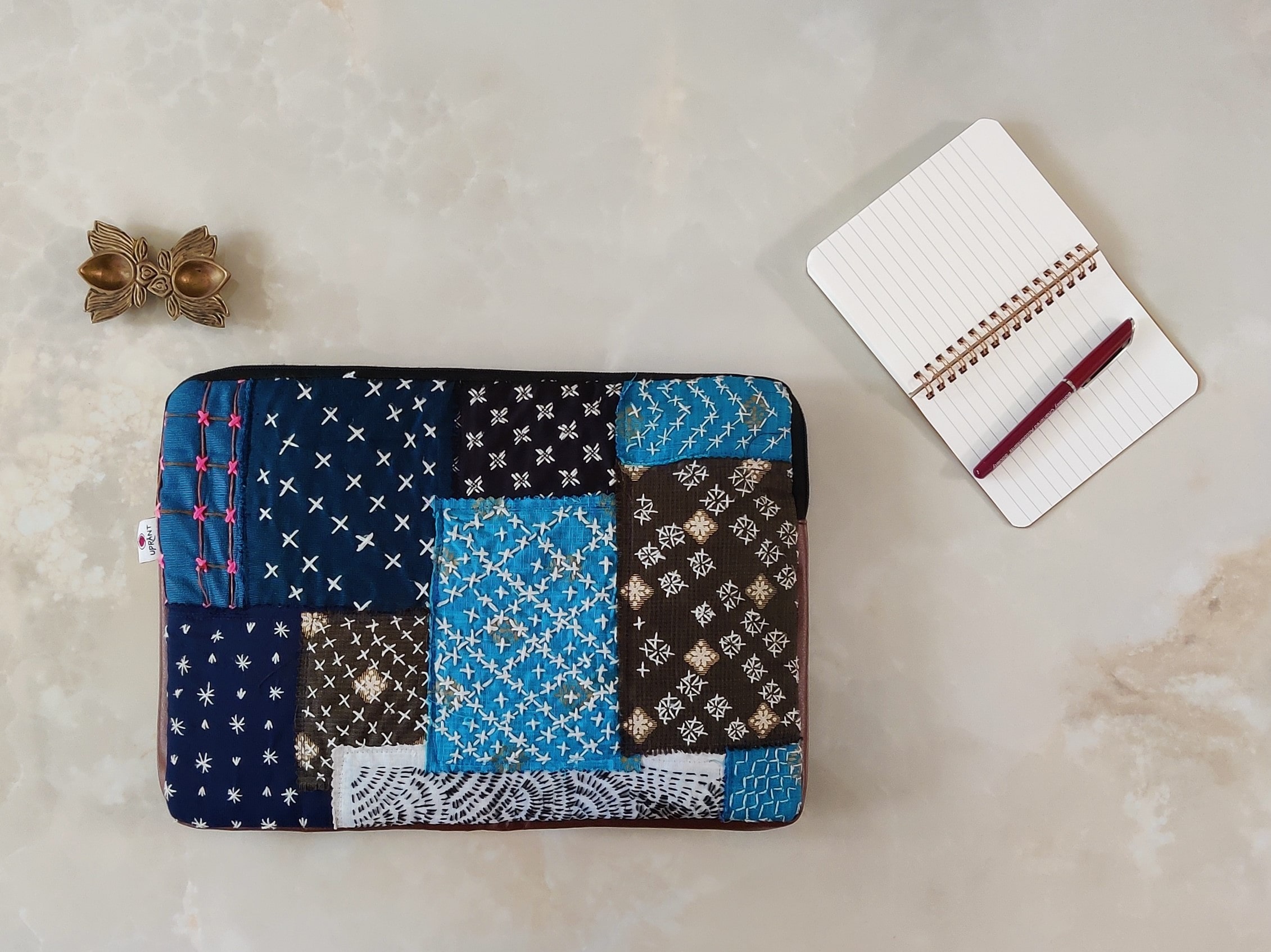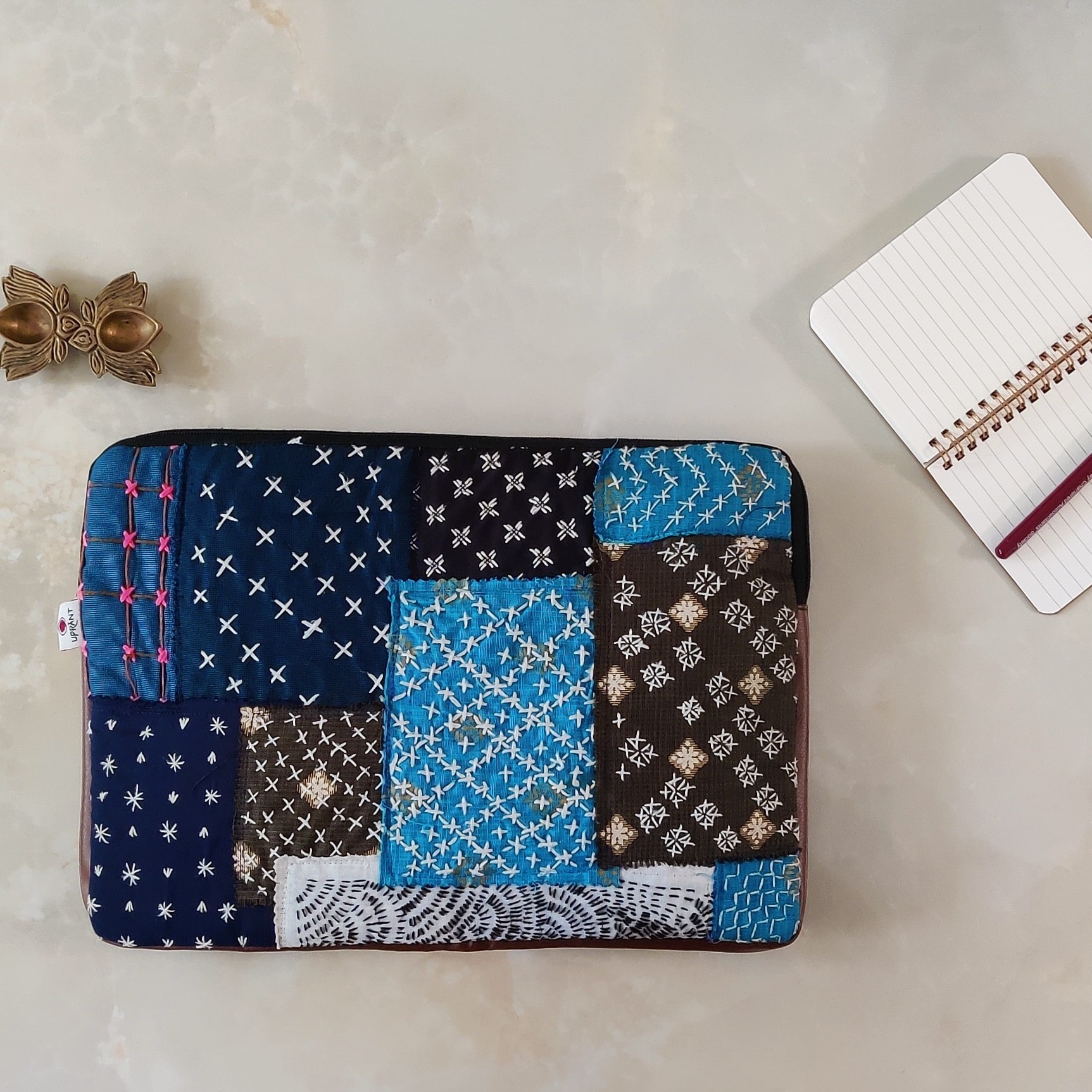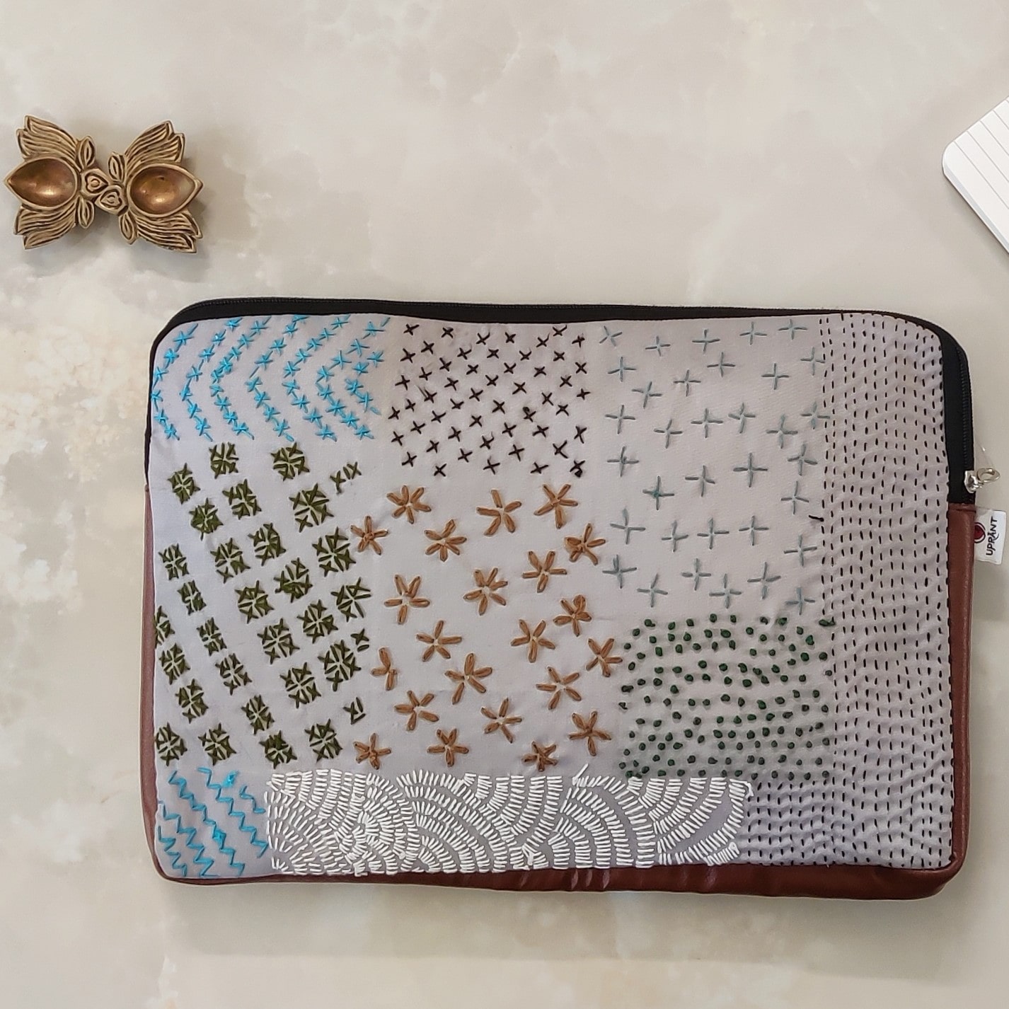 Our eco-friendly laptop sleeve, meticulously crafted from upcycled fabrics and embellished with intricate embroidery stitches. This sustainable accessory provides stylish protection for your laptop, combining functionality with a unique, handcrafted touch. Make a statement while reducing your environmental footprint!