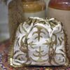 This beautiful Golden tissue batwa(Potli Bag) with mul-mul applique work comes with adustable string and is embellished with fabric flower. Pair this batwa with Indian or Western outfits for any occasion, weddings or festive parties. This bag can hold your essentials including phone, purse, etc. This is a perfect gifting option for the special one in your life.